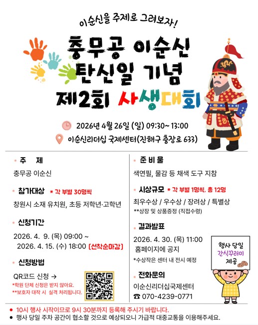 이순신 탄신일을 맞이하여 이순신리더십 국제센터에서는 어린이와 청소년들에게 이순신 장군의 애국정신과 리더십을 기리고 창의적 표현 능력을 함양할 수 있는 기회를 제공하고자 [제 2회 충무공 이순신 탄신일 기념 사생대회]를 개최하오니 많은 관심과 참여를 부탁드립니다. 가. 일 시 : 2026년 04월 26일(일) 09시 30분 ~ 13시 나. 장 소 : 이순신리더십 국제센터 (창원시 진해구 충장로 633) 다. 참가 대상 : 창원시 소재 유치원, 초등 저학년, 초등 고학년 (각 부별 30명) 라. 신청 기간 : 2026년 04월 09일(목) 09시 ~ 04월 15일(수) 18시 [선착순 마감] 마. 신청 방법 : 포스터 내 QR코드 신청 바. 문의 사항 : 이순신리더십 국제센터 T. 070-4239-0771