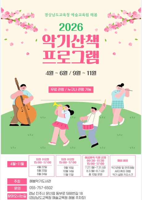 경상남도 교육청 예술교육원 해봄악기도서관에서는 악기관람 및 체험 기회 확대를 위해 "악기산책 프로그램"